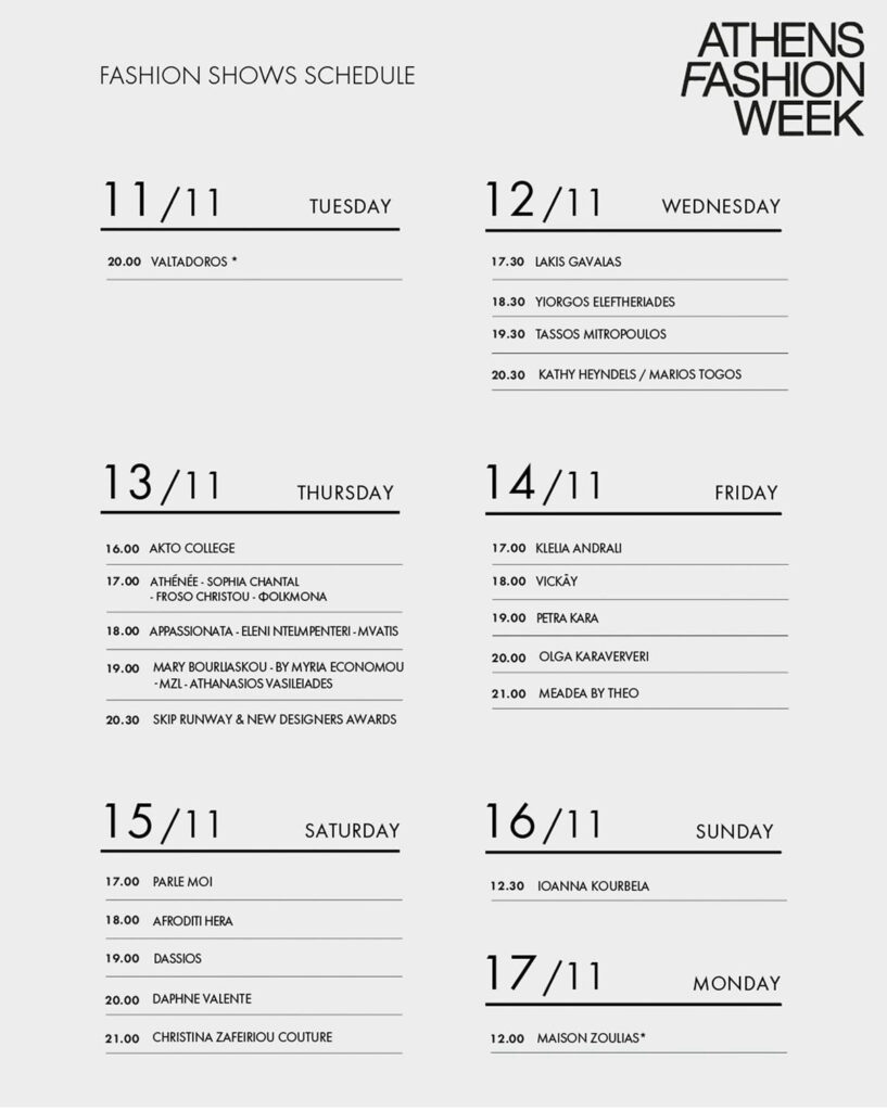 The 37th Athens Fashion Week runs for 7 days, includes 22 fashion shows, and officially starts on November 11, 2025.